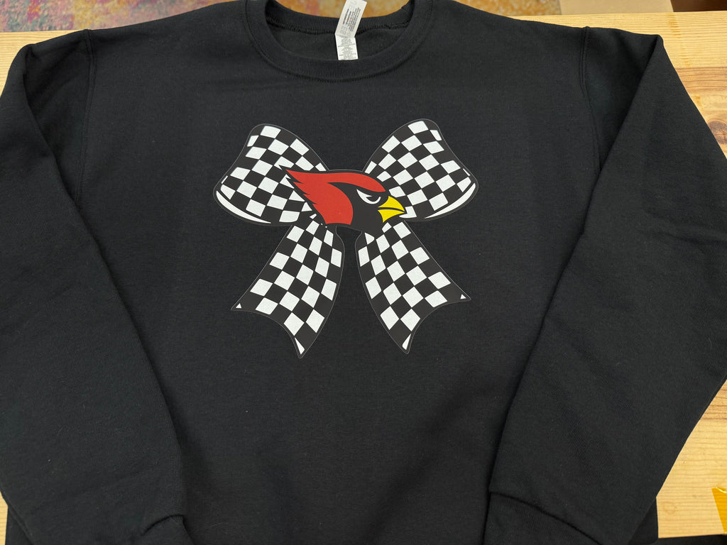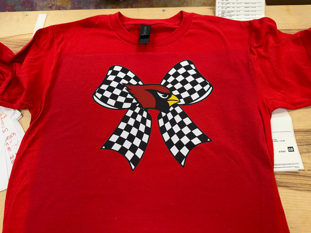 Get ready to elevate your game with the Cardinals Bow Tee or Sweatshirt Shirt! Show your love for the Farmington Cardinals while looking stylish with the checkered bow design. Perfect for game days or everyday wear. Go Cards!